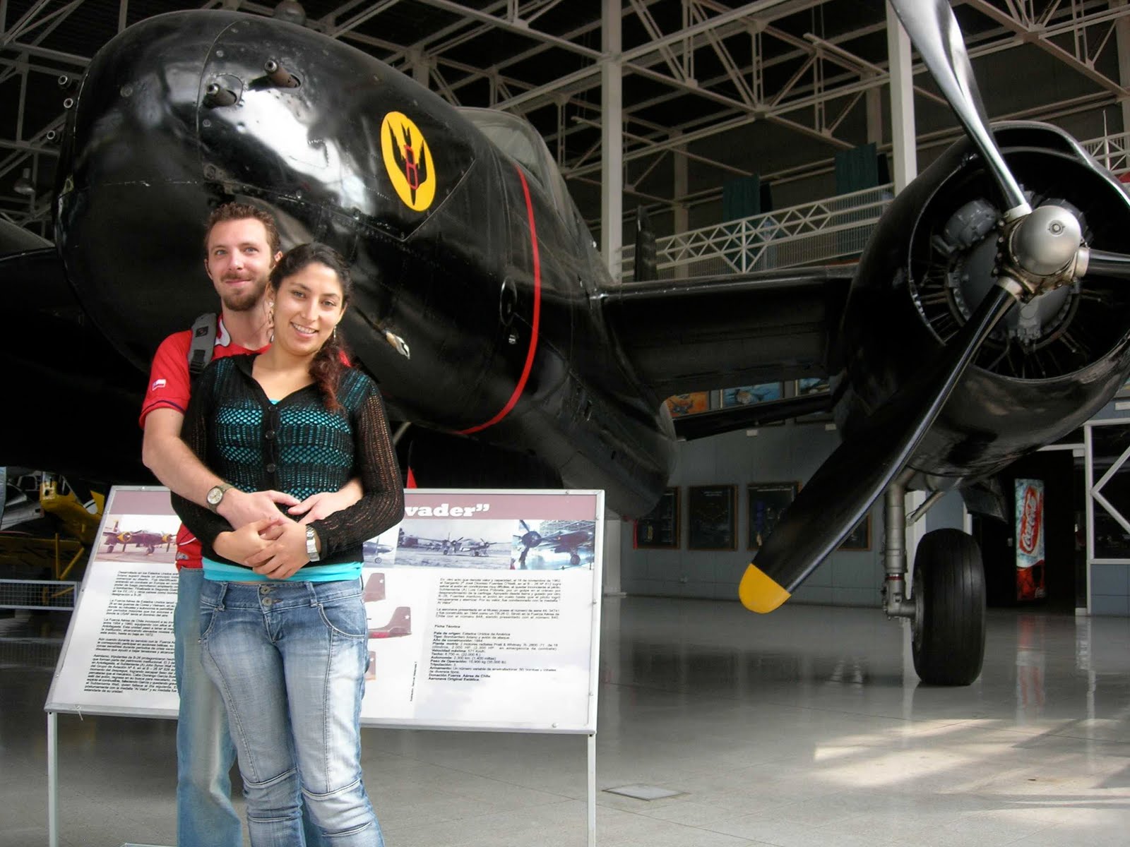 Ma Teresita et Cédric font les malins, ils ne devraient pas, ils posent devant le modèle de chasseur bombardier qui a servi à bombarder la Moneda (des frappes chirugicales déjà à l'époque), le palais présidentiel chilien lors du coup d'état du 11 septembre 1973.